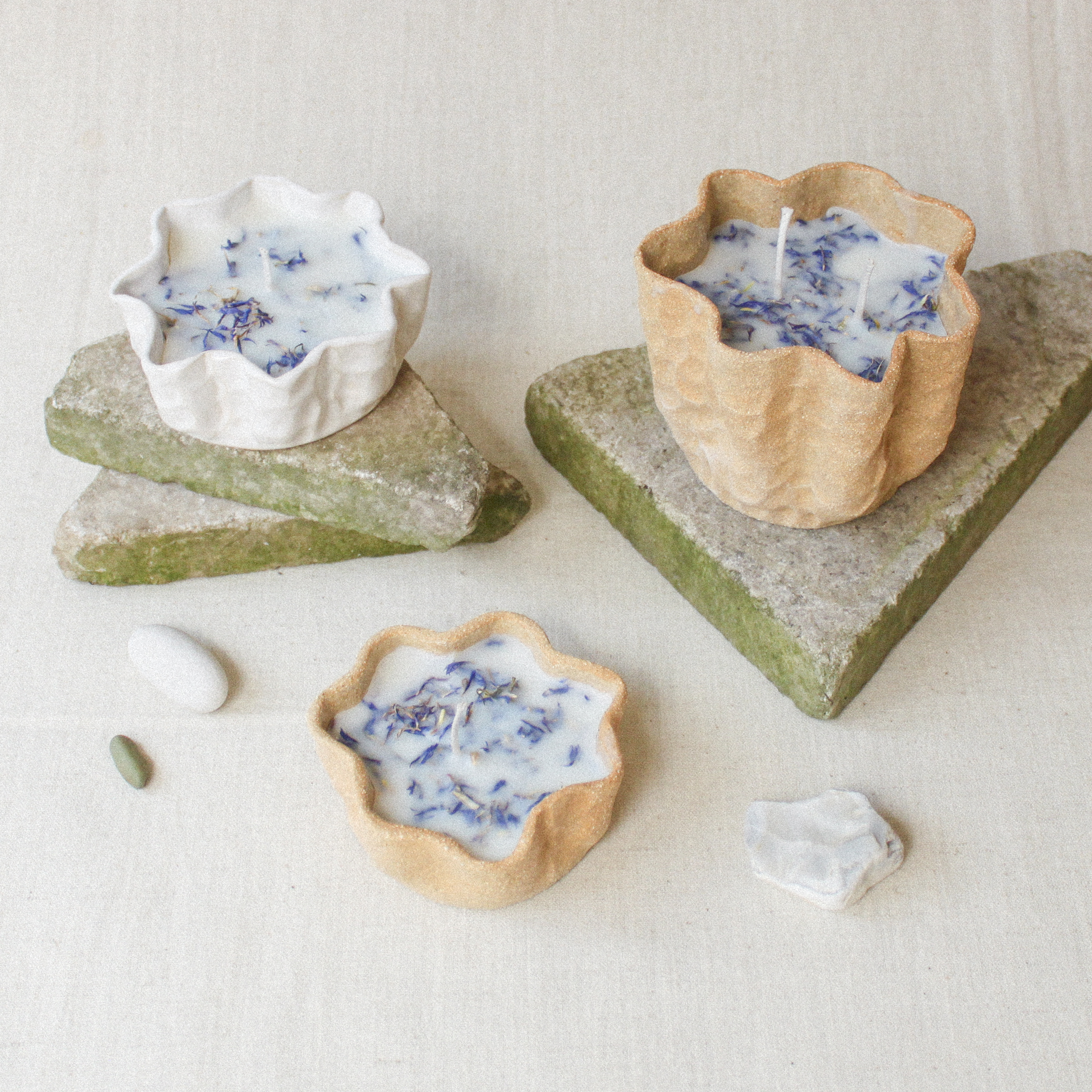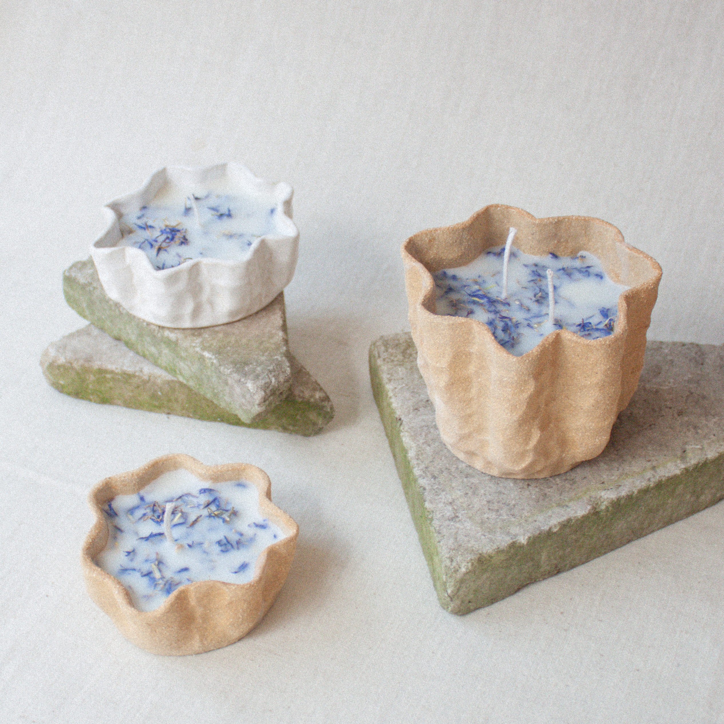 Svíčky jsou vyrobené ze směsi sojového a kokosového vosku. Obsahují přírodní esenci z levandule, citronové trávy a bergamotu. Ve vrchní části vosku je sušená chrpa. Každý kus je ručně vyrobený, proto se jednotlivé produkty mohou nepatrně lišit.