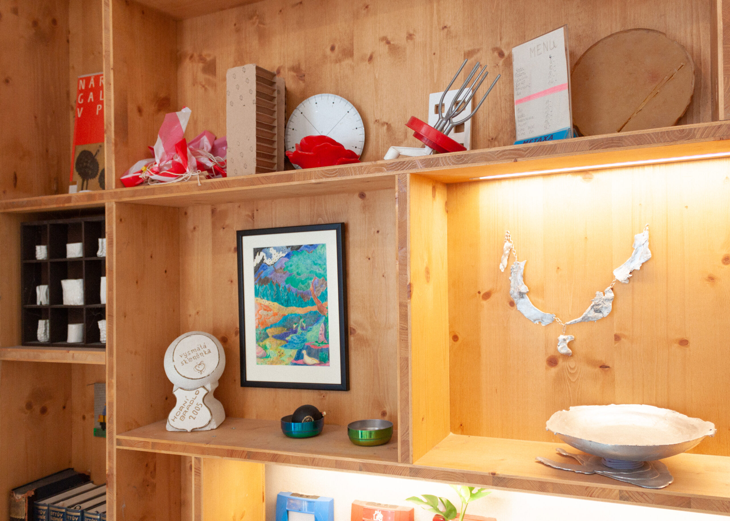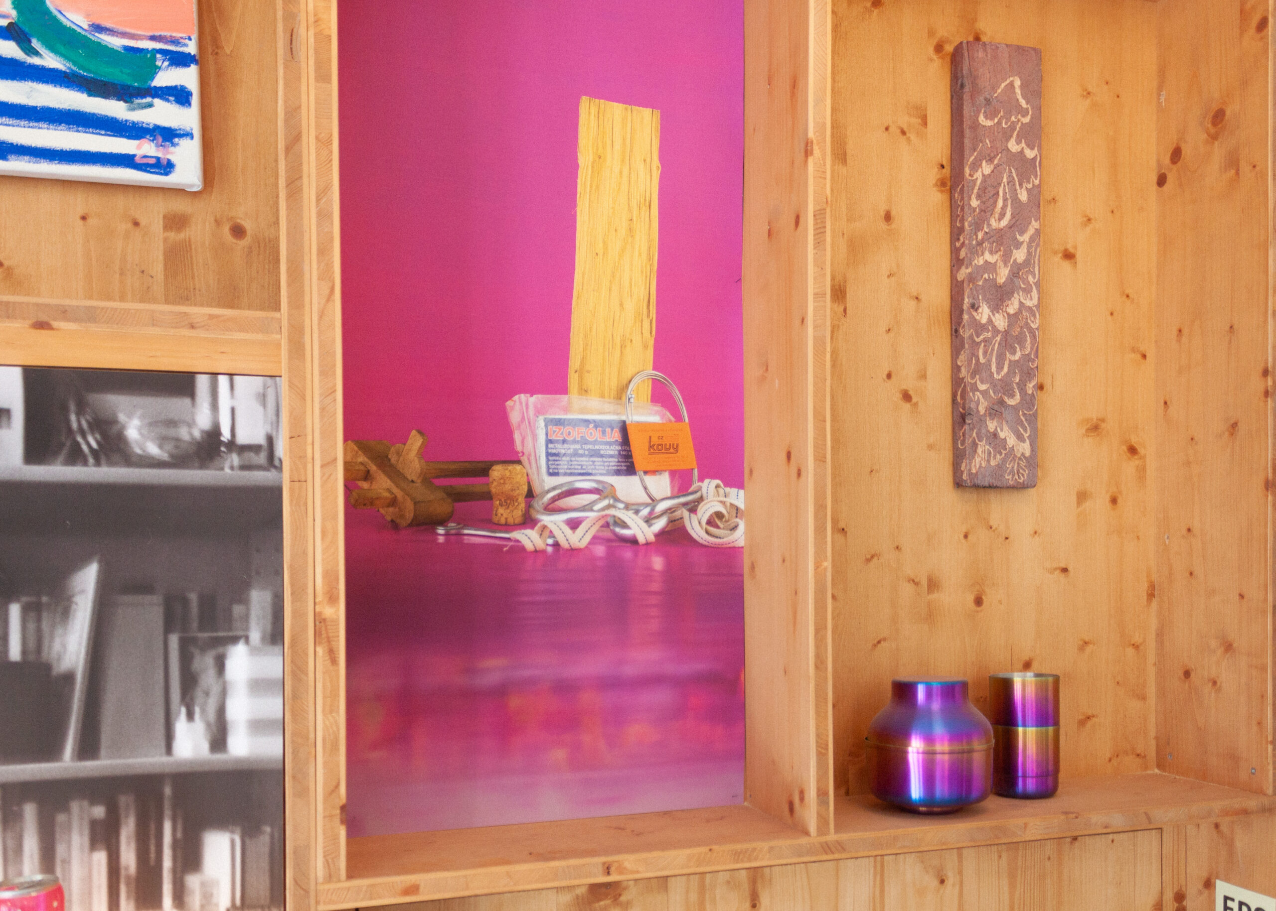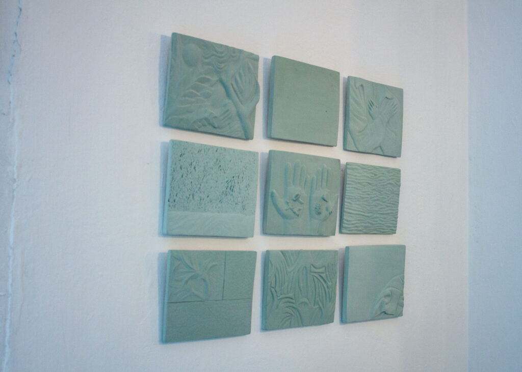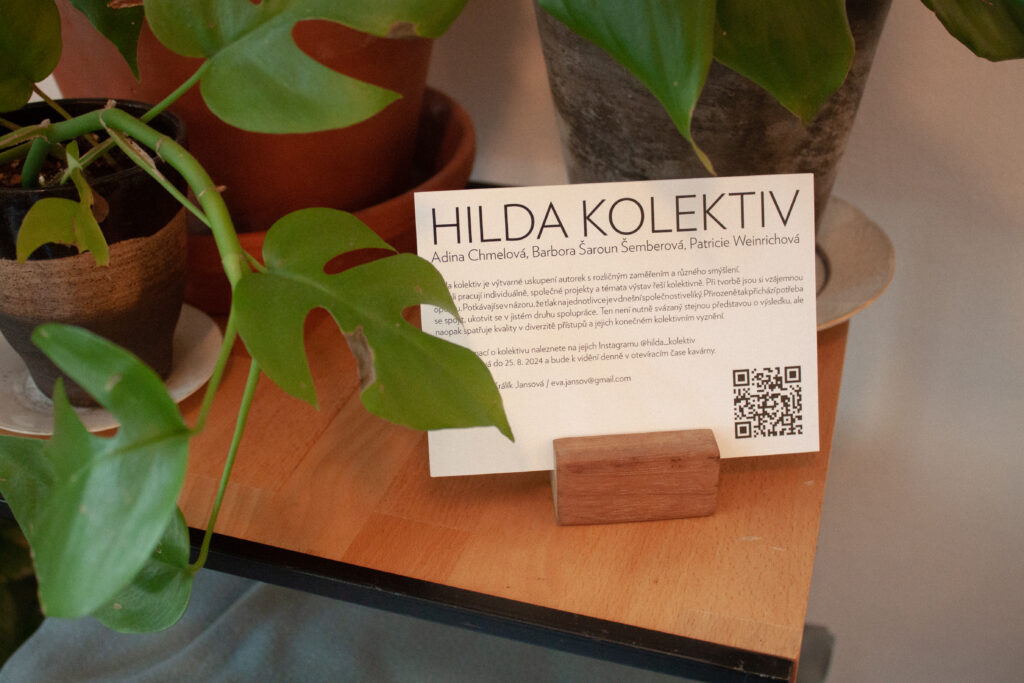 Patricie přináší do prostoru sošky rostlin a reliérfní objekty, které vyrůstají z myšlenky propojení, růstu a vzájemné podpory. Tři rostliny na hranolech odkazují k trojici kolektivu – k rozdílnosti, která se navzájem doplňuje, prorůstá a tvoří celek. Hilda jako ekosystém s vlastními rytmy, potřebnou péčí a uzemnění. Nízký stolek se stává místem návratu – zázemím, ke kterému se vracíme, když se třeba znovu spočinout, zorientovat se nebo jen být spolu. Nástěný reliéf pak tiše sleduje z proměnlivých obrazů sdíleného času, jako otisk, který vzniká pomalu, vrstvami, bez přesného návodu.