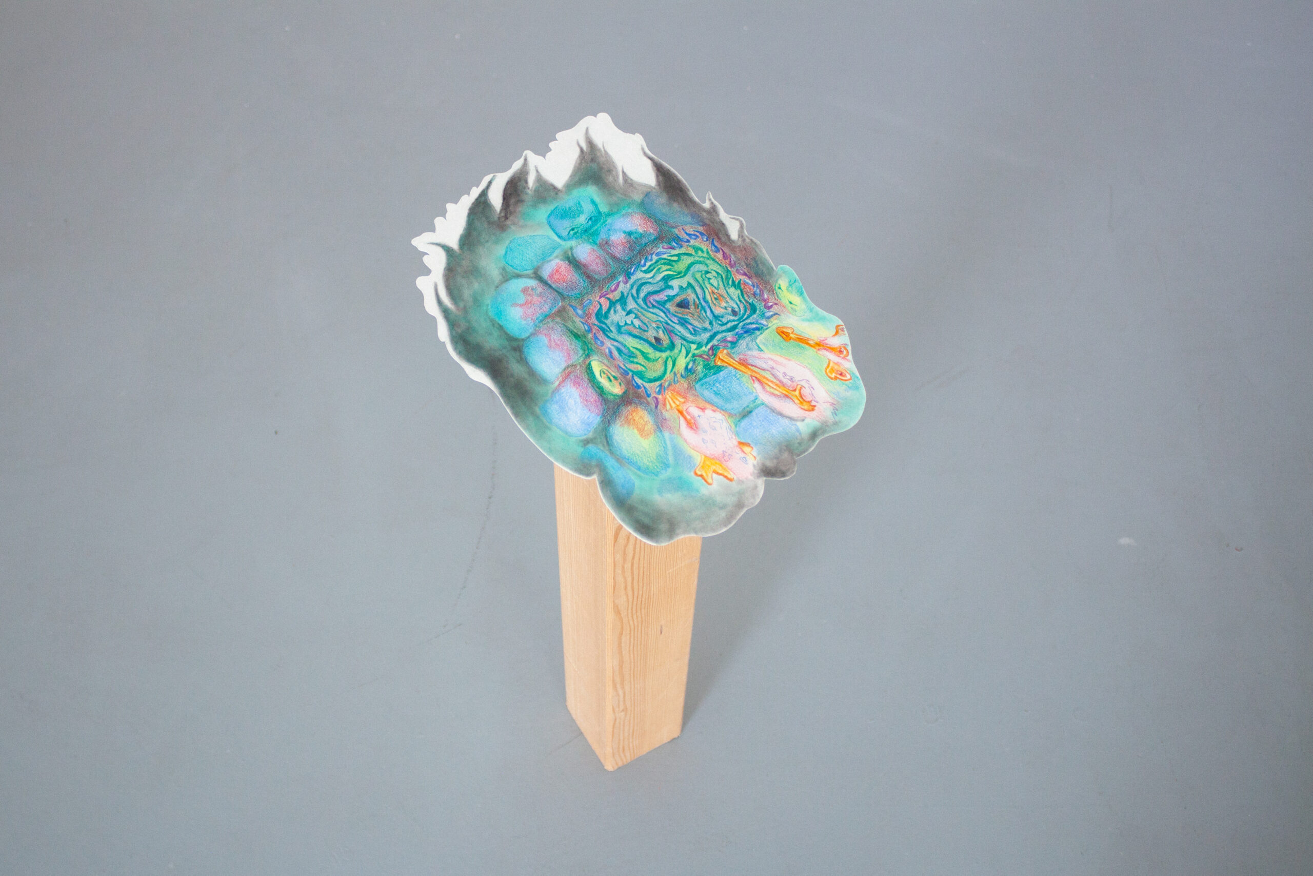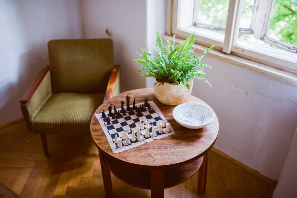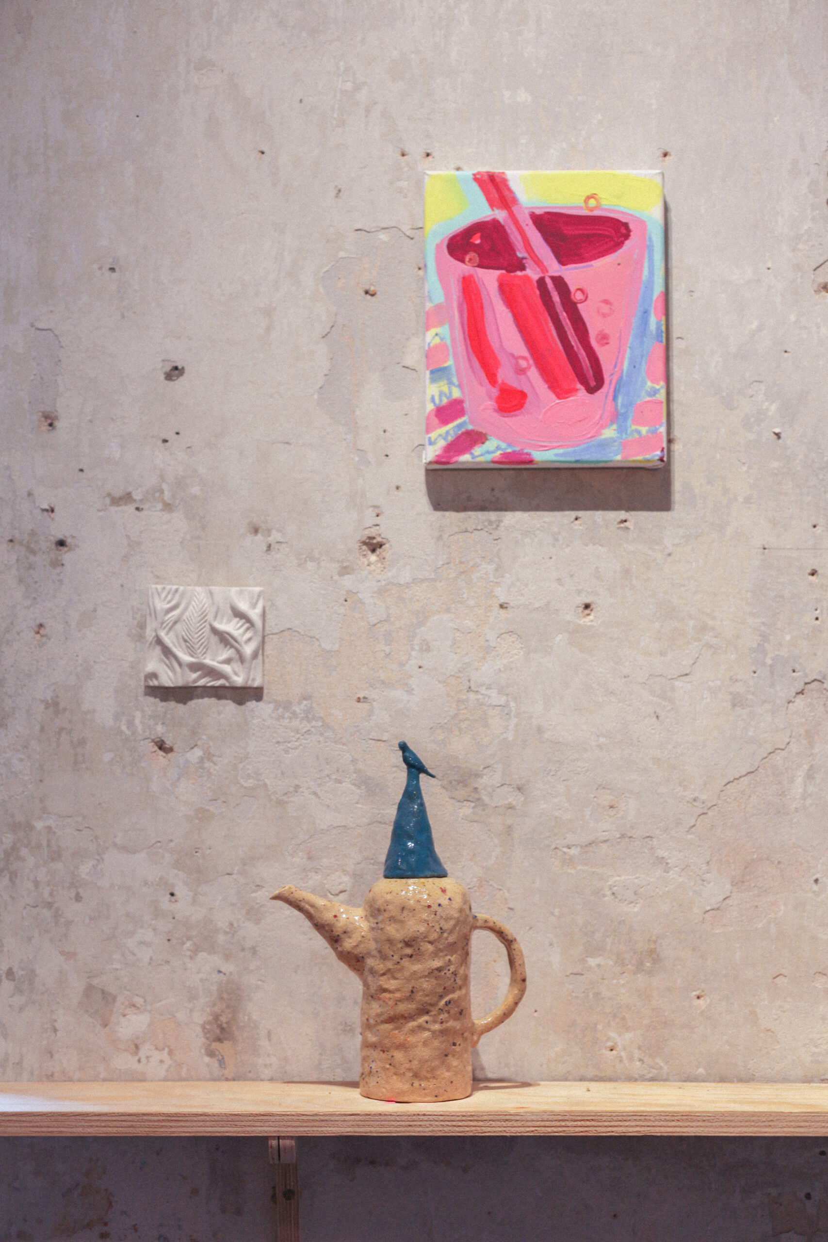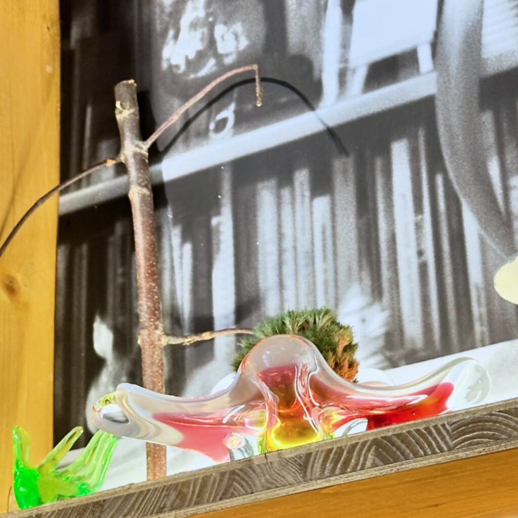 Patricie přináší do prostoru sošky rostlin a reliérfní objekty, které vyrůstají z myšlenky propojení, růstu a vzájemné podpory. Tři rostliny na hranolech odkazují k trojici kolektivu – k rozdílnosti, která se navzájem doplňuje, prorůstá a tvoří celek. Hilda jako ekosystém s vlastními rytmy, potřebnou péčí a uzemnění. Nízký stolek se stává místem návratu – zázemím, ke kterému se vracíme, když se třeba znovu spočinout, zorientovat se nebo jen být spolu. Nástěný reliéf pak tiše sleduje z proměnlivých obrazů sdíleného času, jako otisk, který vzniká pomalu, vrstvami, bez přesného návodu.