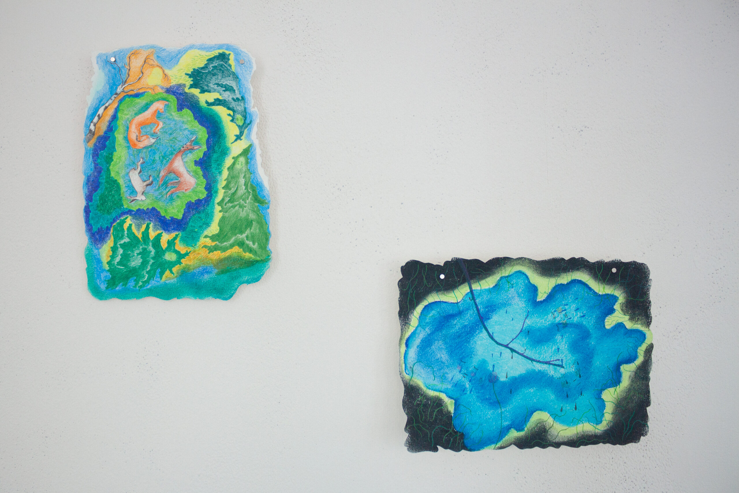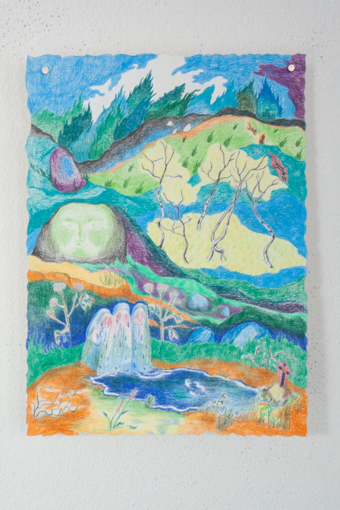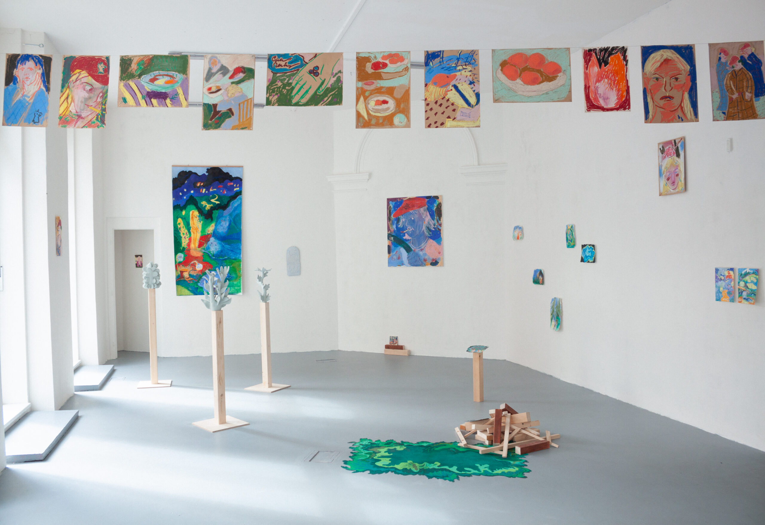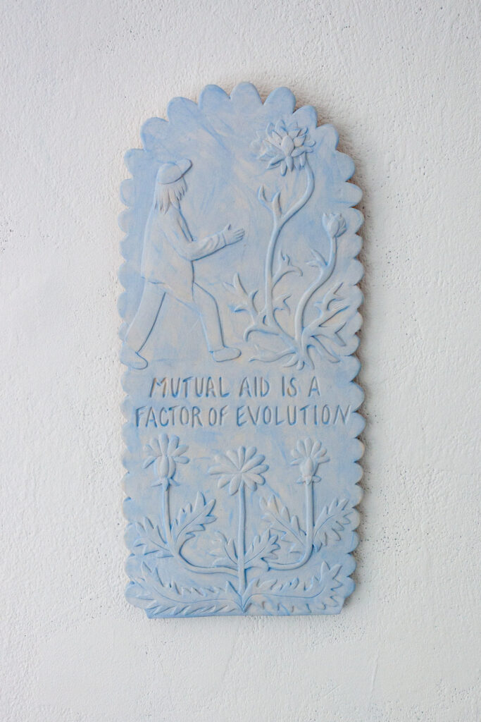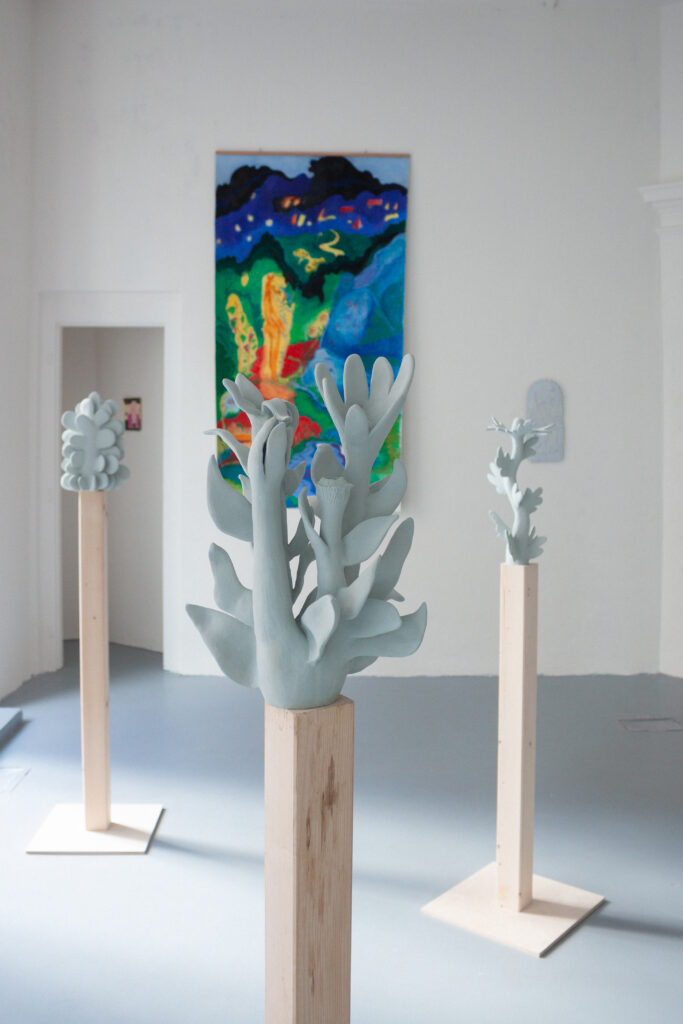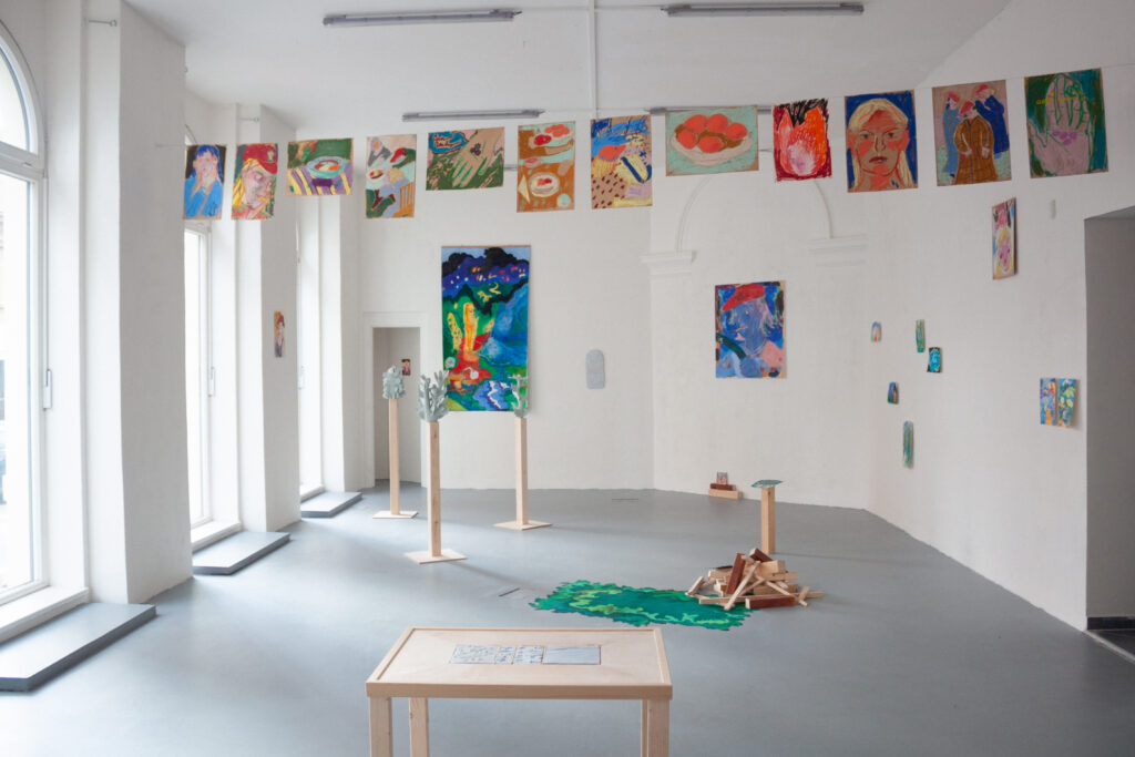Barbora do výstavy vnáší lehce romantickou představu kolektivu, který žije jako postavy z jejích kreslených světů – napůl lidé, napůl bytosti z přírody, obývající příběhy o péči, samotě, lásce i tichém vzdoru. V těchto světech nejsou ostré hranice mezi člověkem, zvířetem a rostlinou, stejně jako volným časem, tvorbou a prací. Hilda se tu proměňuje ve společenství, kde je možné být plačkou, hledačkou pokladů, poustevnicí i květinou – a kde se umění stává způsobem existence, sdíleným rytmem i útočištěm.