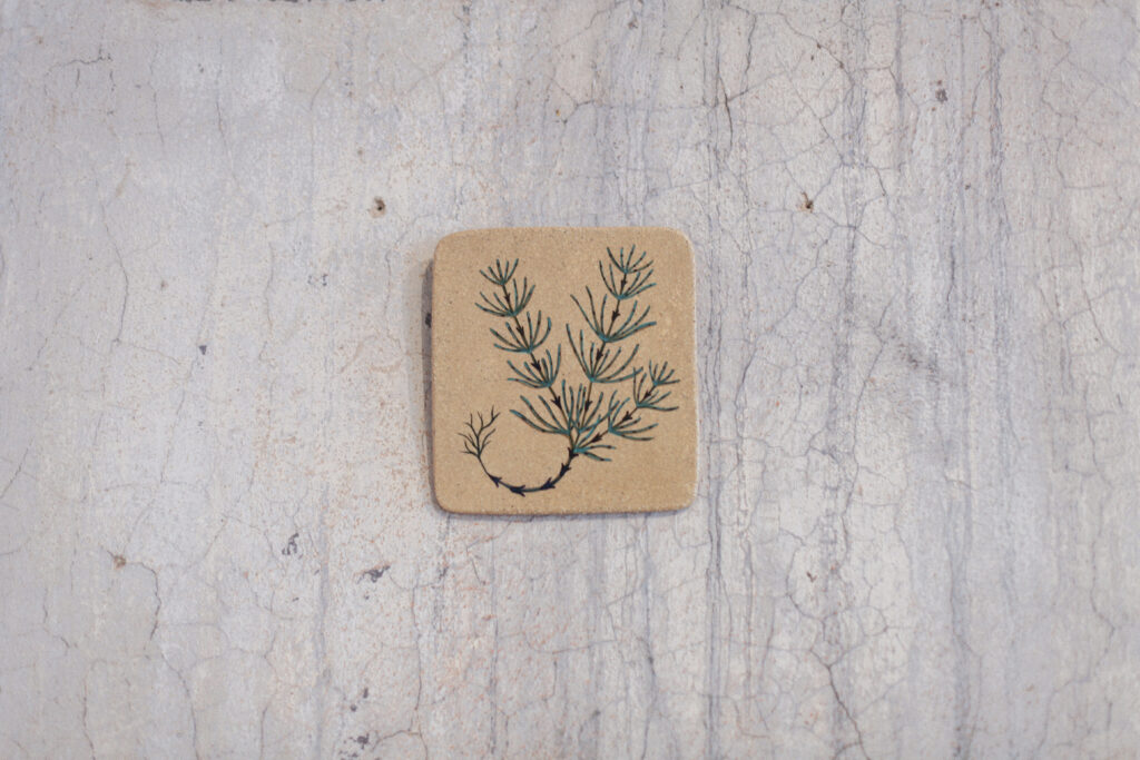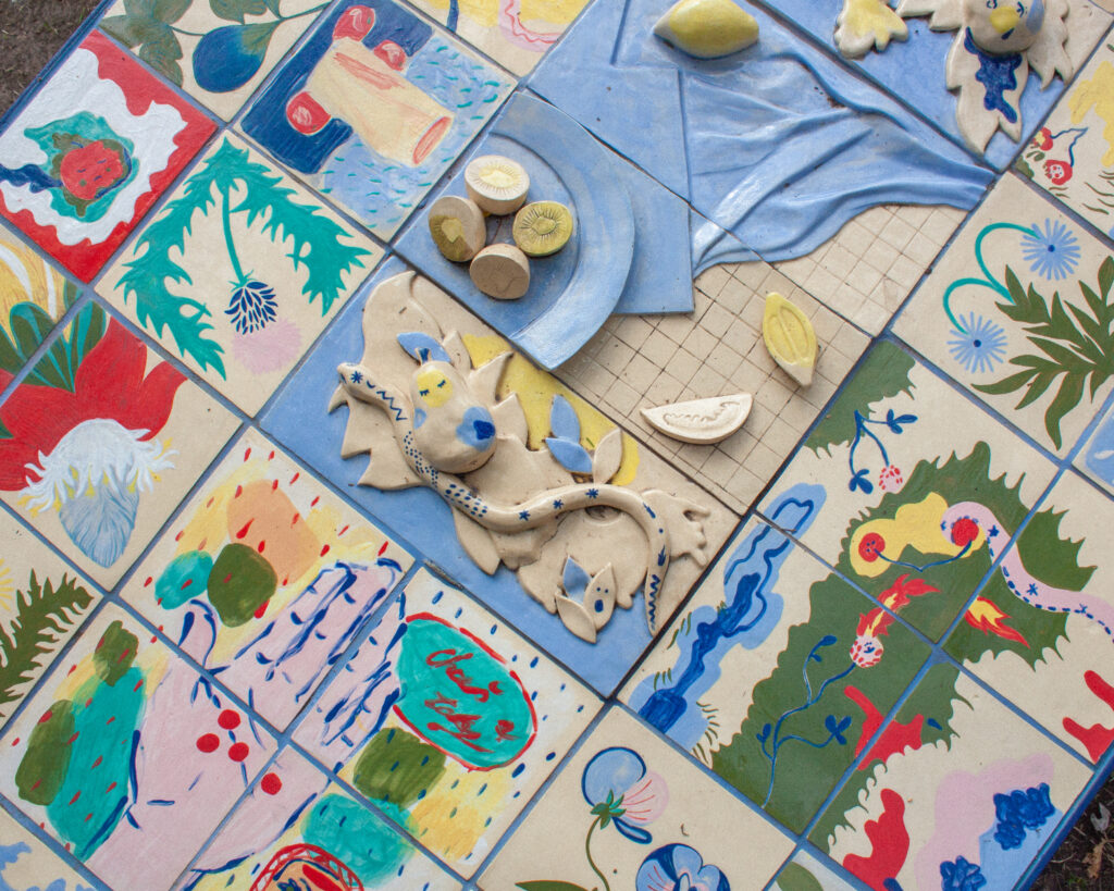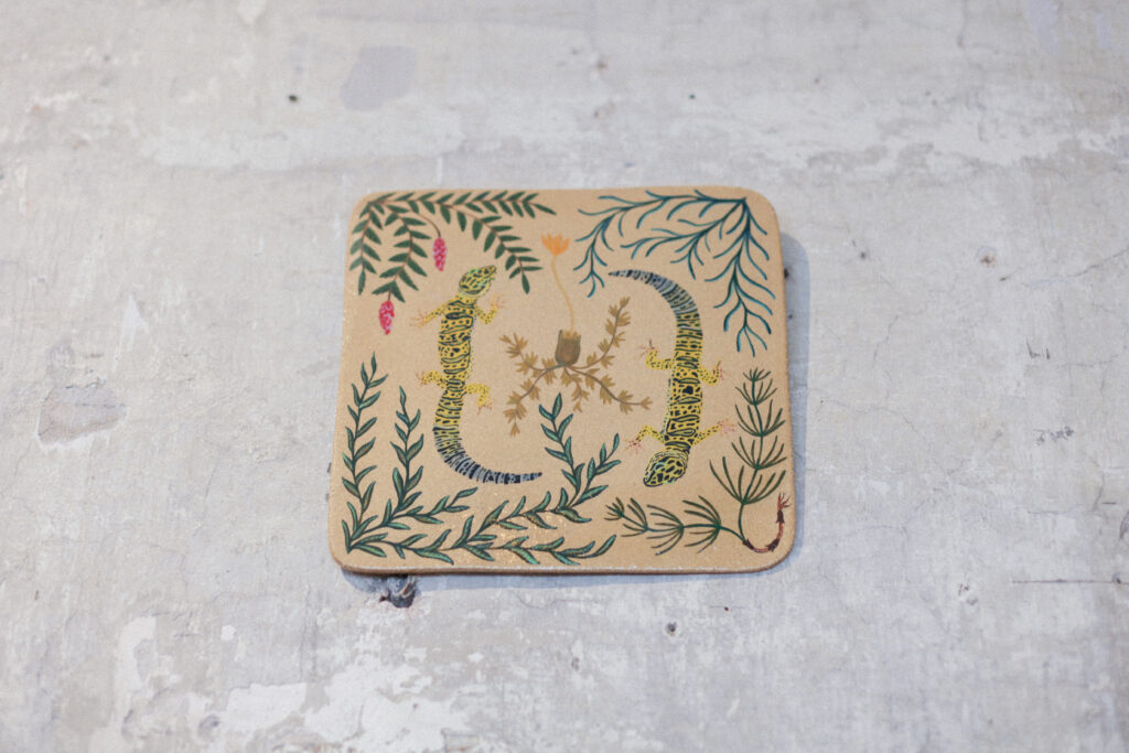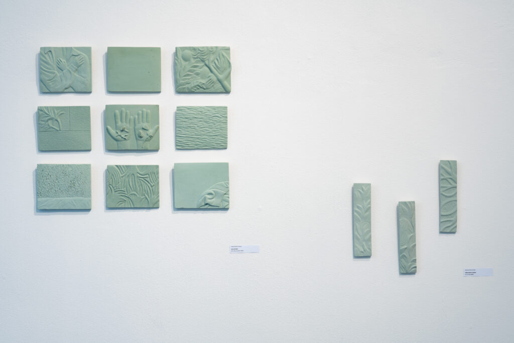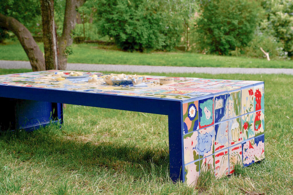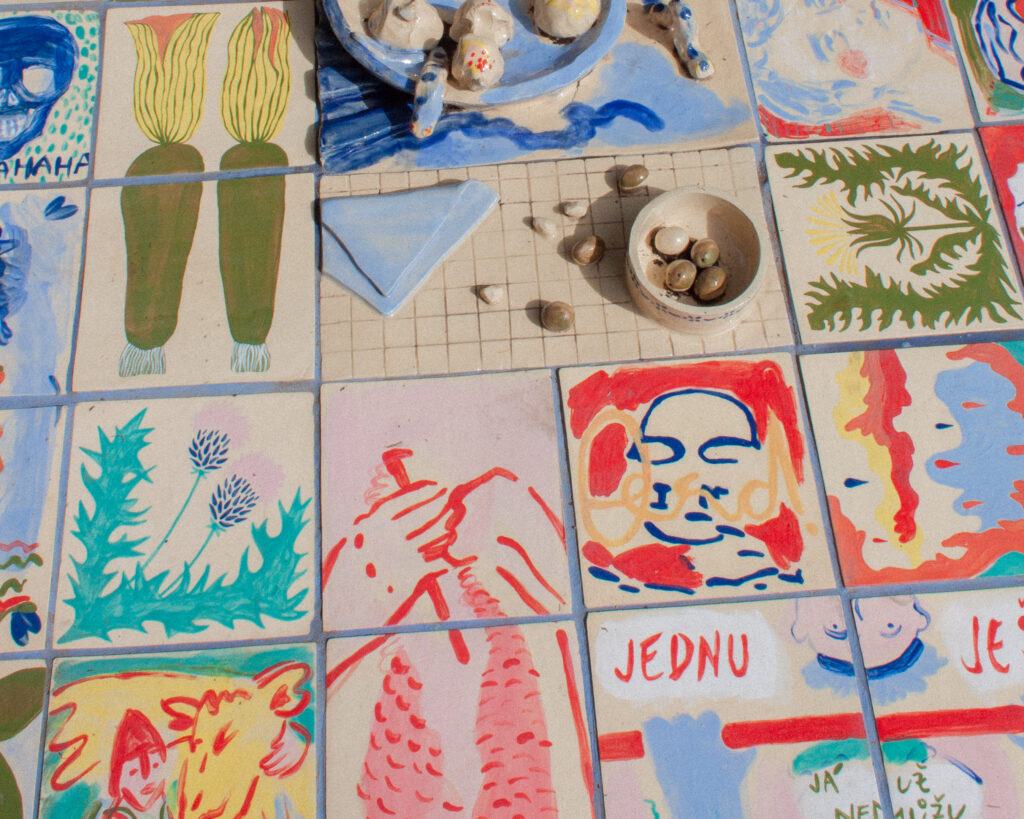 Autorky výstavy Soft Seasons, Hard Hands skrze ručně malované keramické dlaždice skládají stůl jako místo sdílení, paměti a fantazie. Každá z nich přináší vlastní jazyk vyprávění: vzpomínky, lidovou slovesnost, vymyšlené příběhy o jedlých rostlinách i přírodní motivy zakotvené v hliněném těle. Malba a keramika se zde potkávají v dialogu mezi tím, co bylo, a tím, co si ještě můžeme představit.