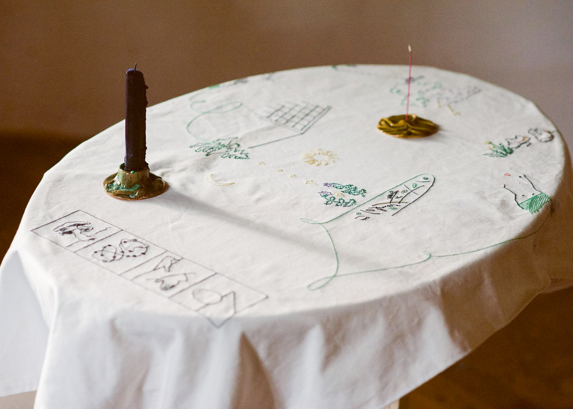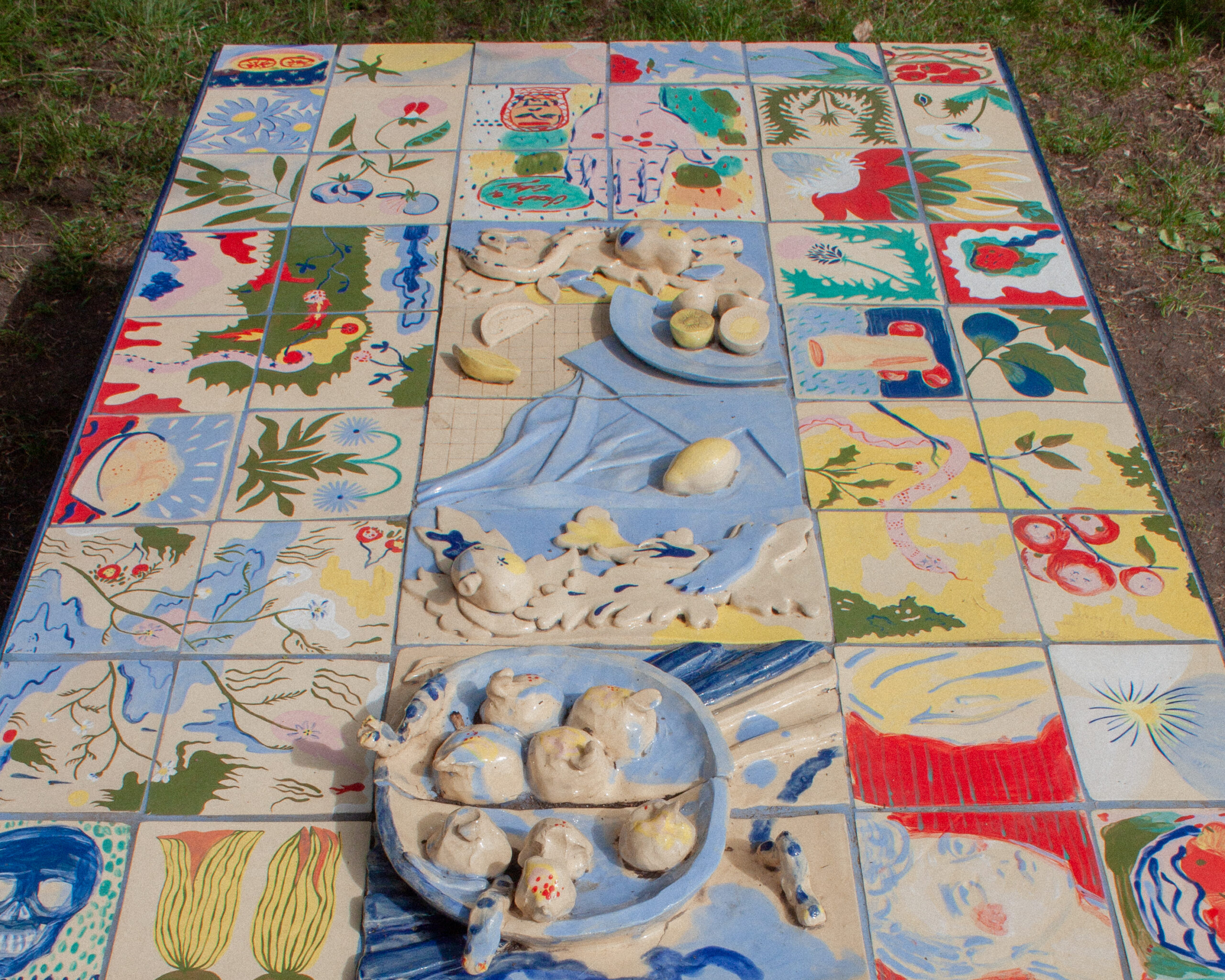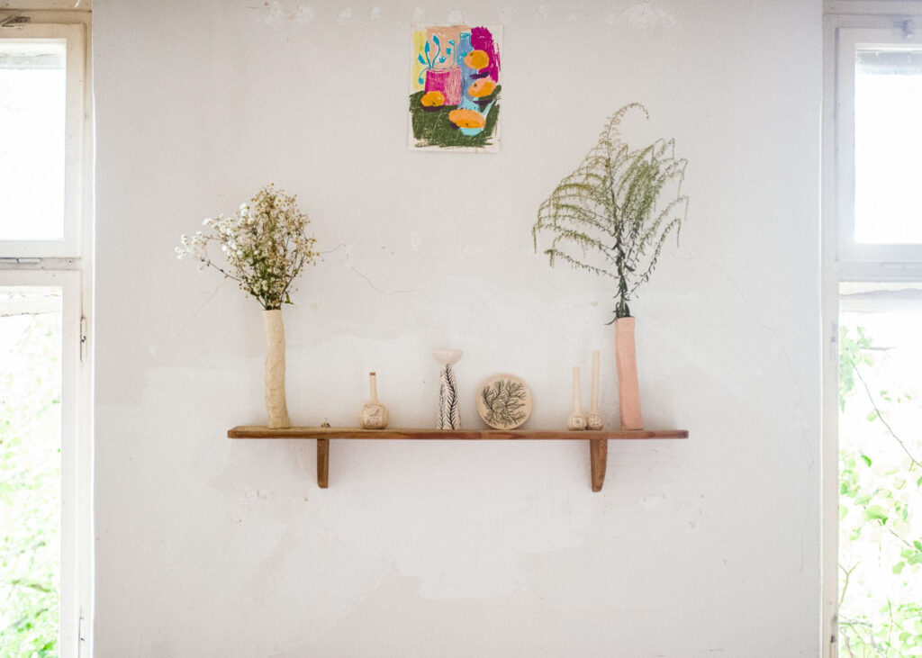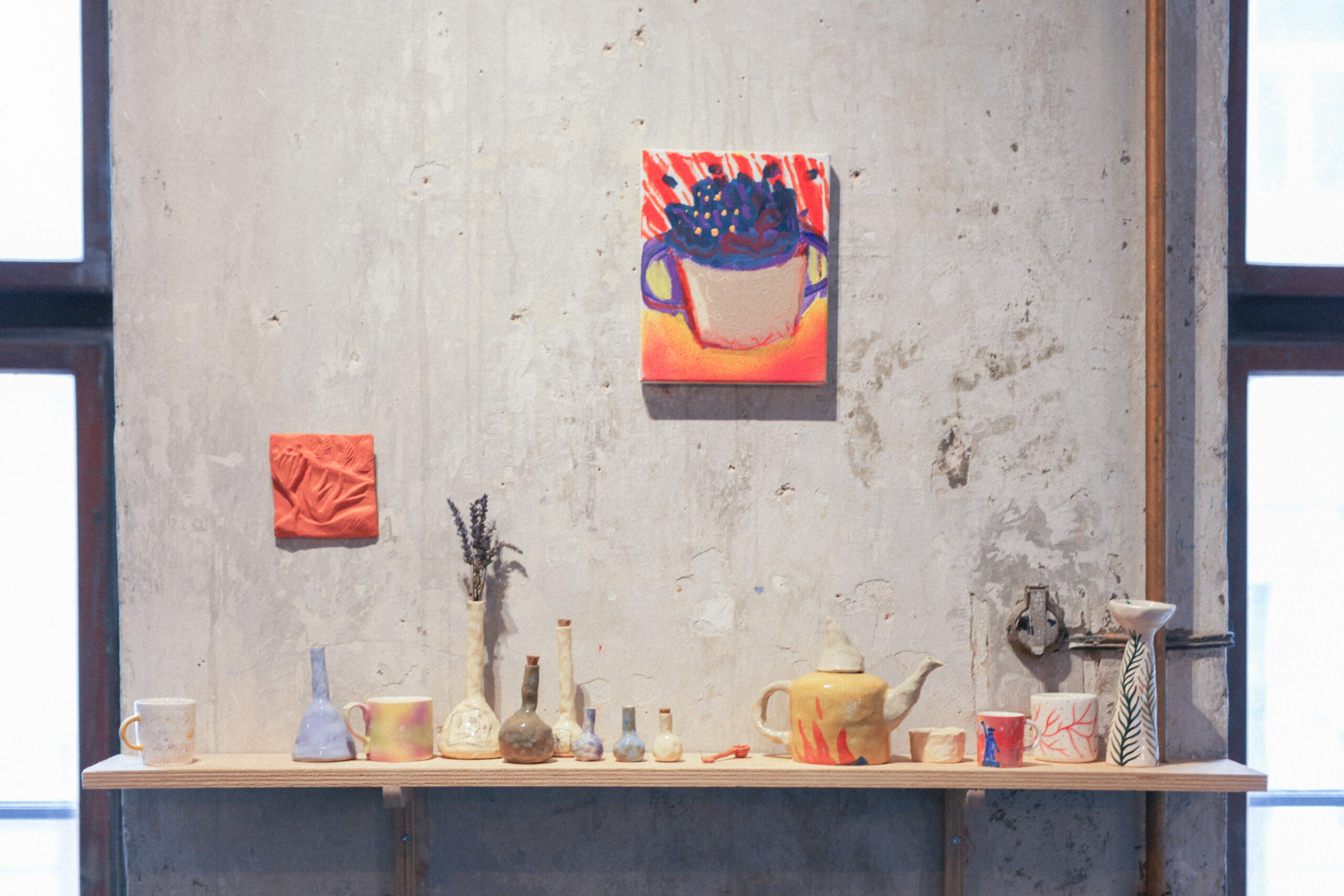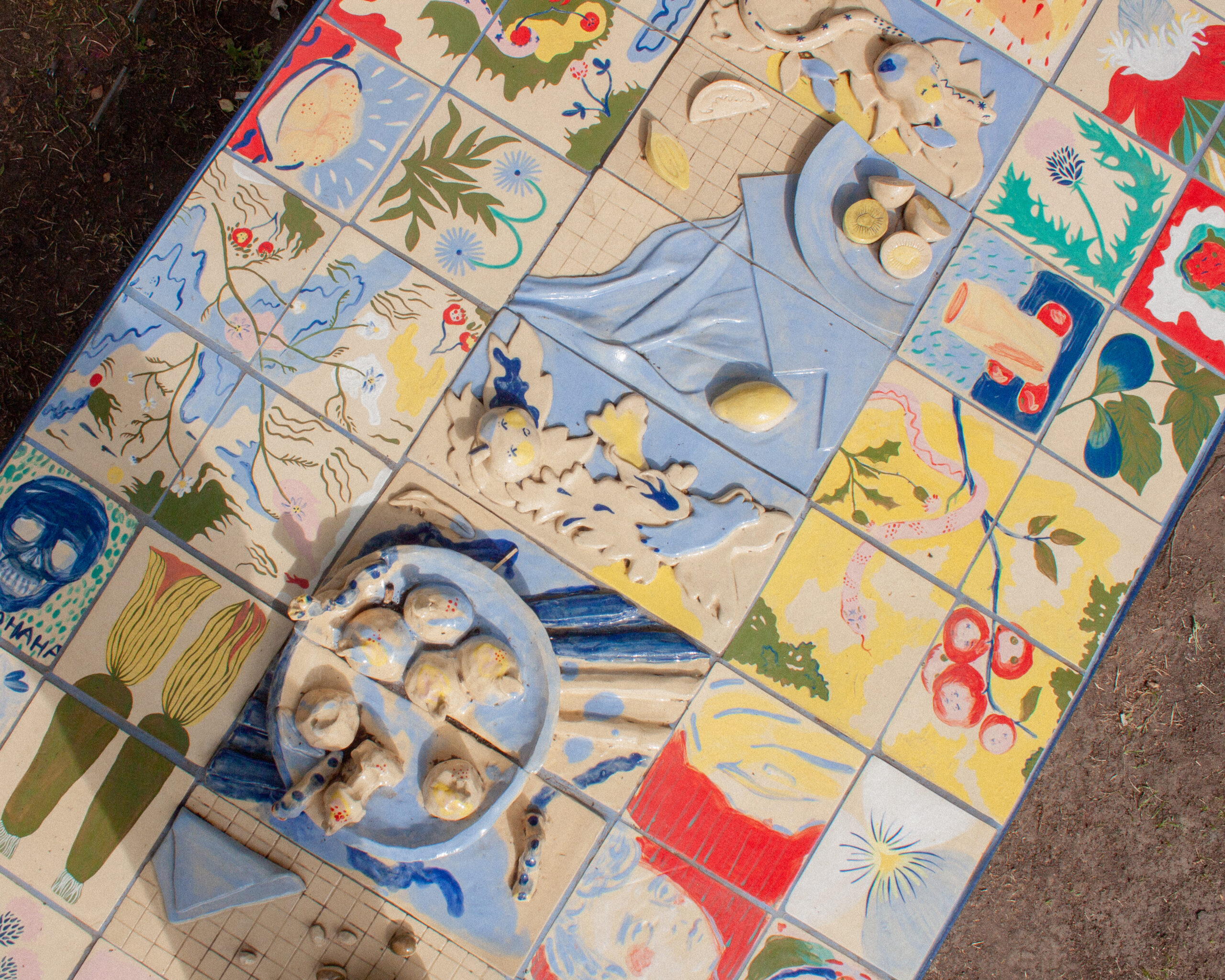 Autorky výstavy Soft Seasons, Hard Hands skrze ručně malované keramické dlaždice skládají stůl jako místo sdílení, paměti a fantazie. Každá z nich přináší vlastní jazyk vyprávění: vzpomínky, lidovou slovesnost, vymyšlené příběhy o jedlých rostlinách i přírodní motivy zakotvené v hliněném těle. Malba a keramika se zde potkávají v dialogu mezi tím, co bylo, a tím, co si ještě můžeme představit.