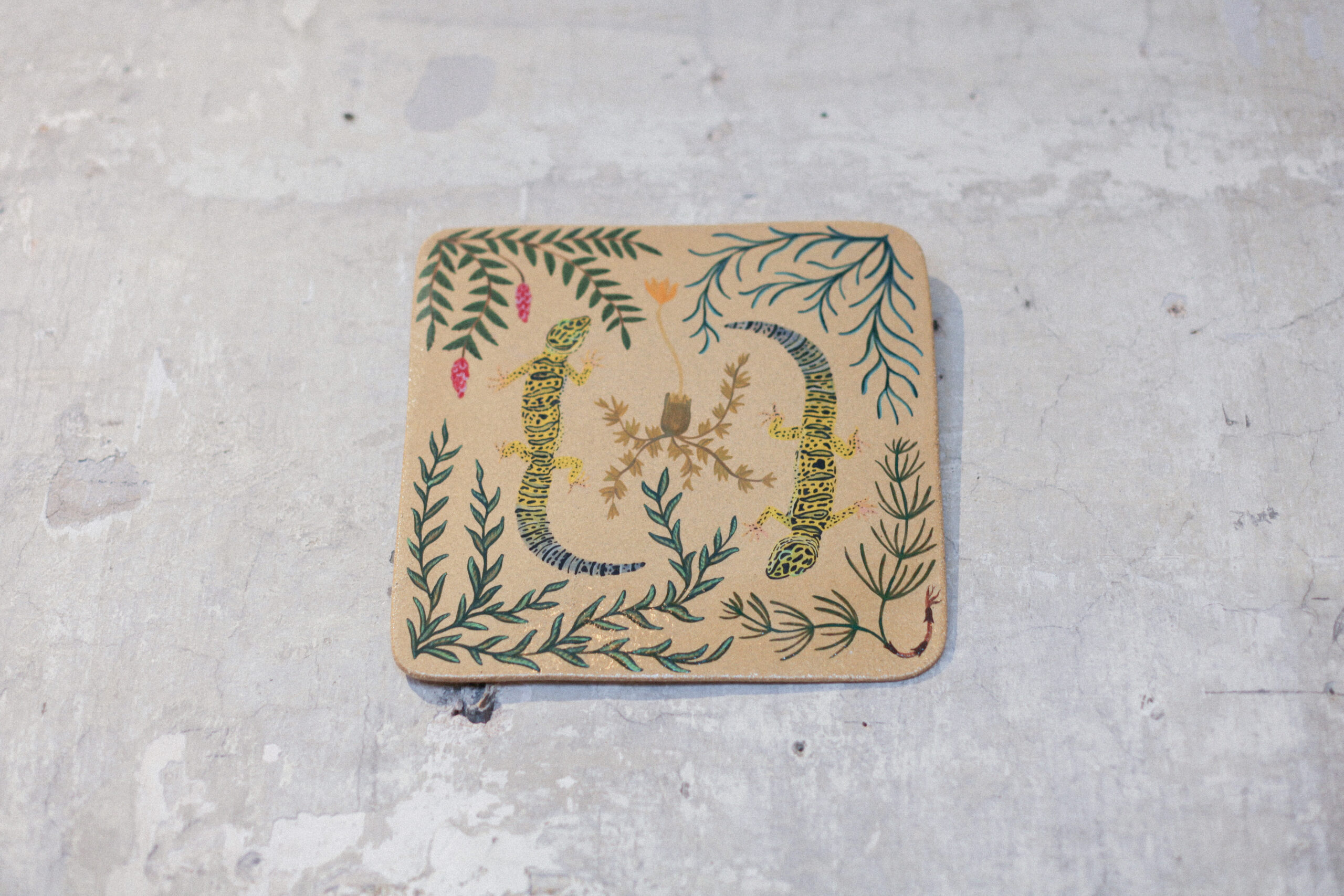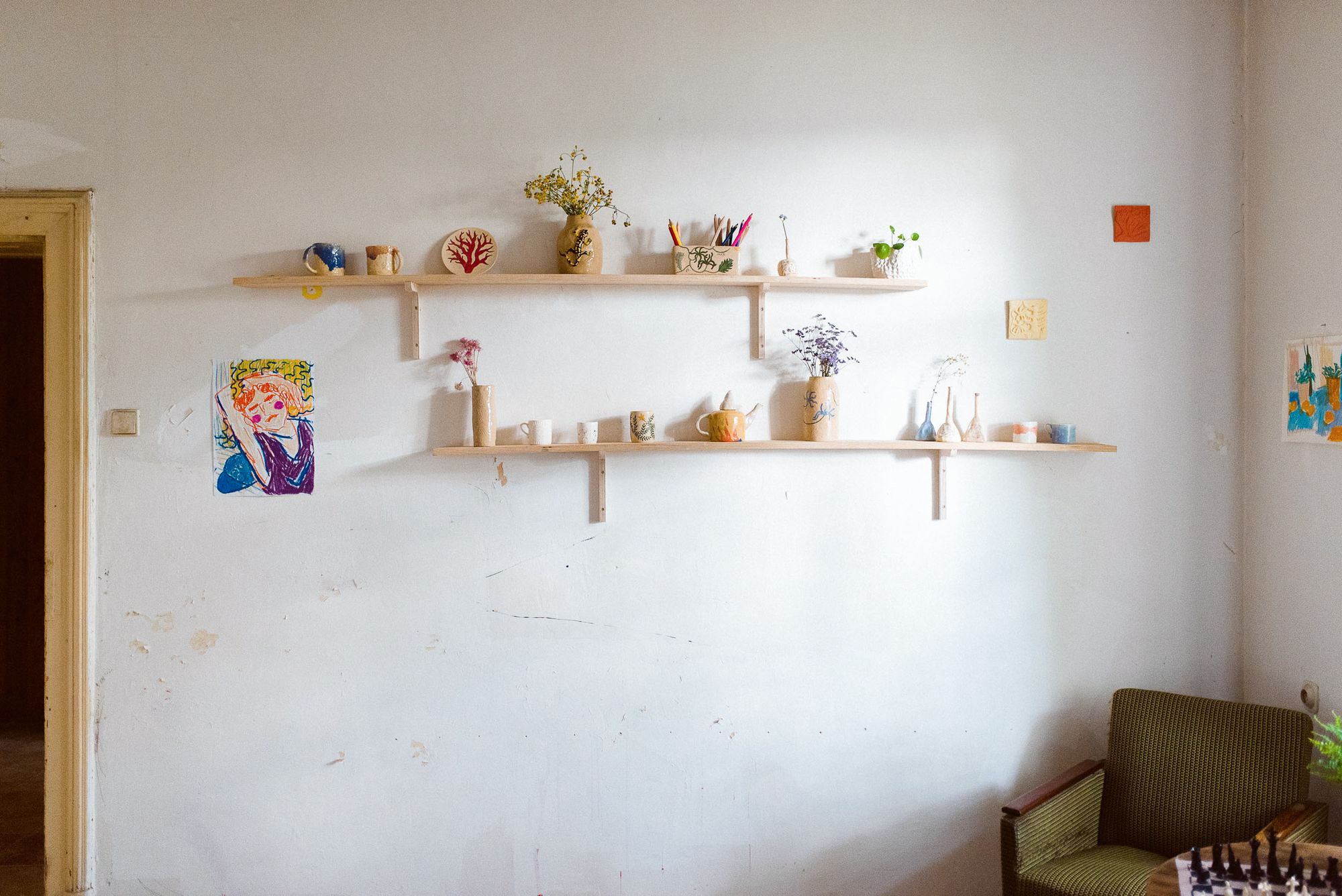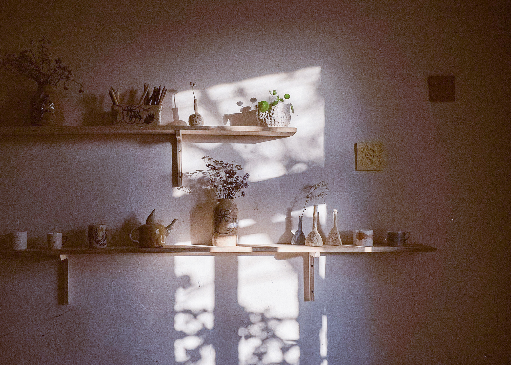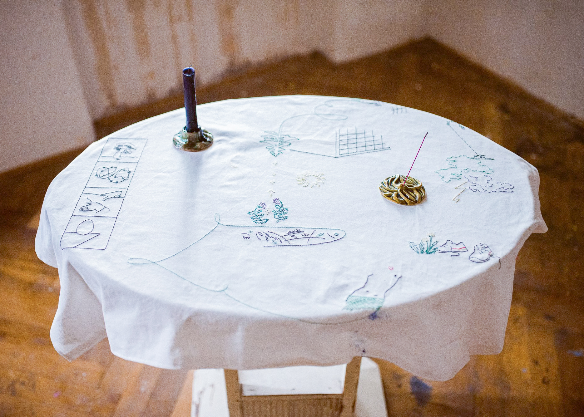 Autorky výstavy Soft Seasons, Hard Hands skrze ručně malované keramické dlaždice skládají stůl jako místo sdílení, paměti a fantazie. Každá z nich přináší vlastní jazyk vyprávění: vzpomínky, lidovou slovesnost, vymyšlené příběhy o jedlých rostlinách i přírodní motivy zakotvené v hliněném těle. Malba a keramika se zde potkávají v dialogu mezi tím, co bylo, a tím, co si ještě můžeme představit.