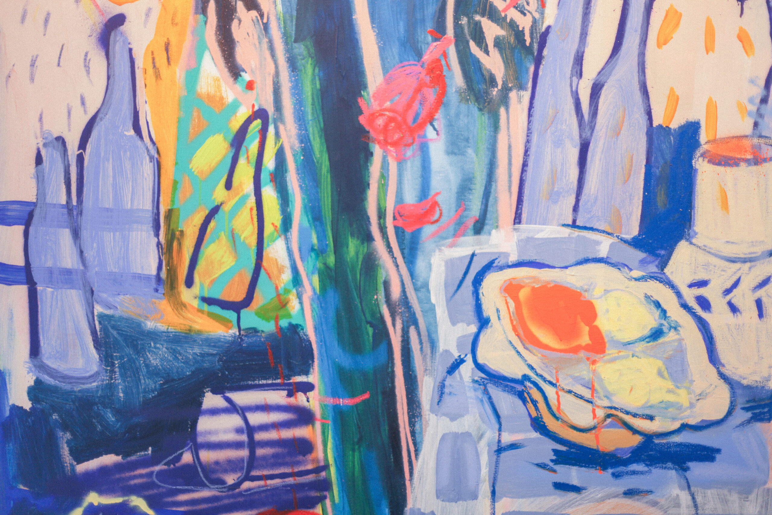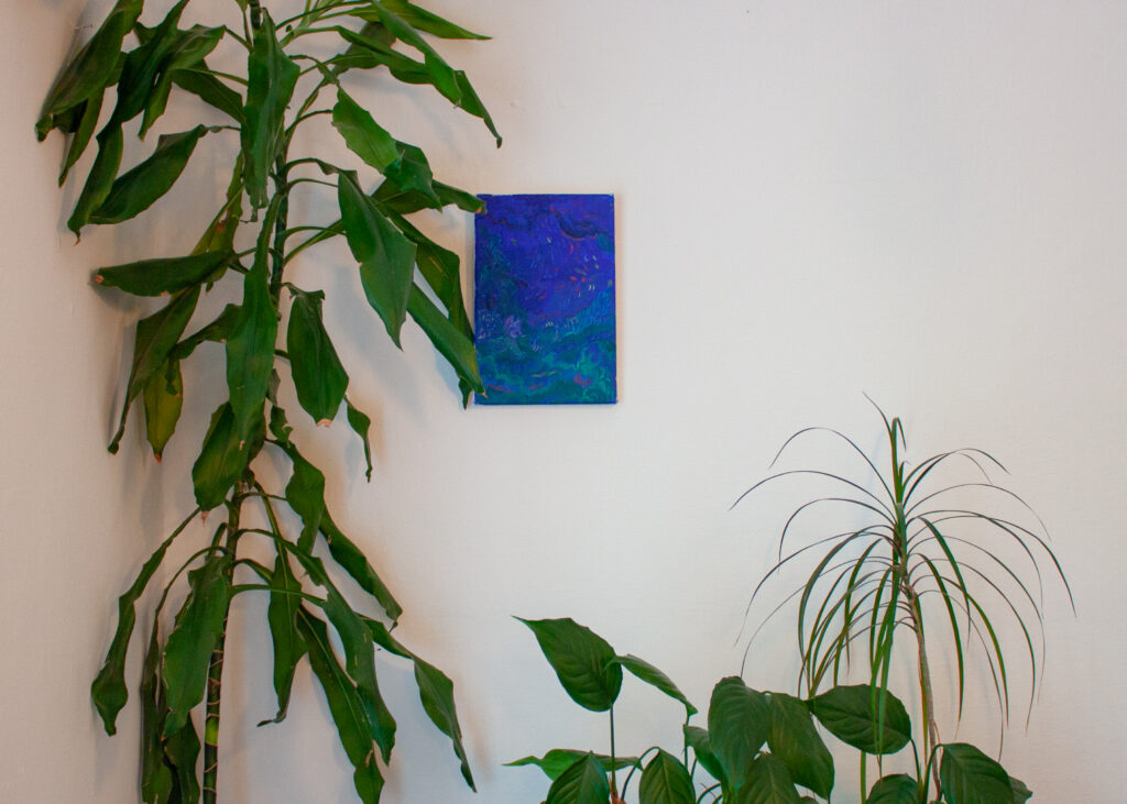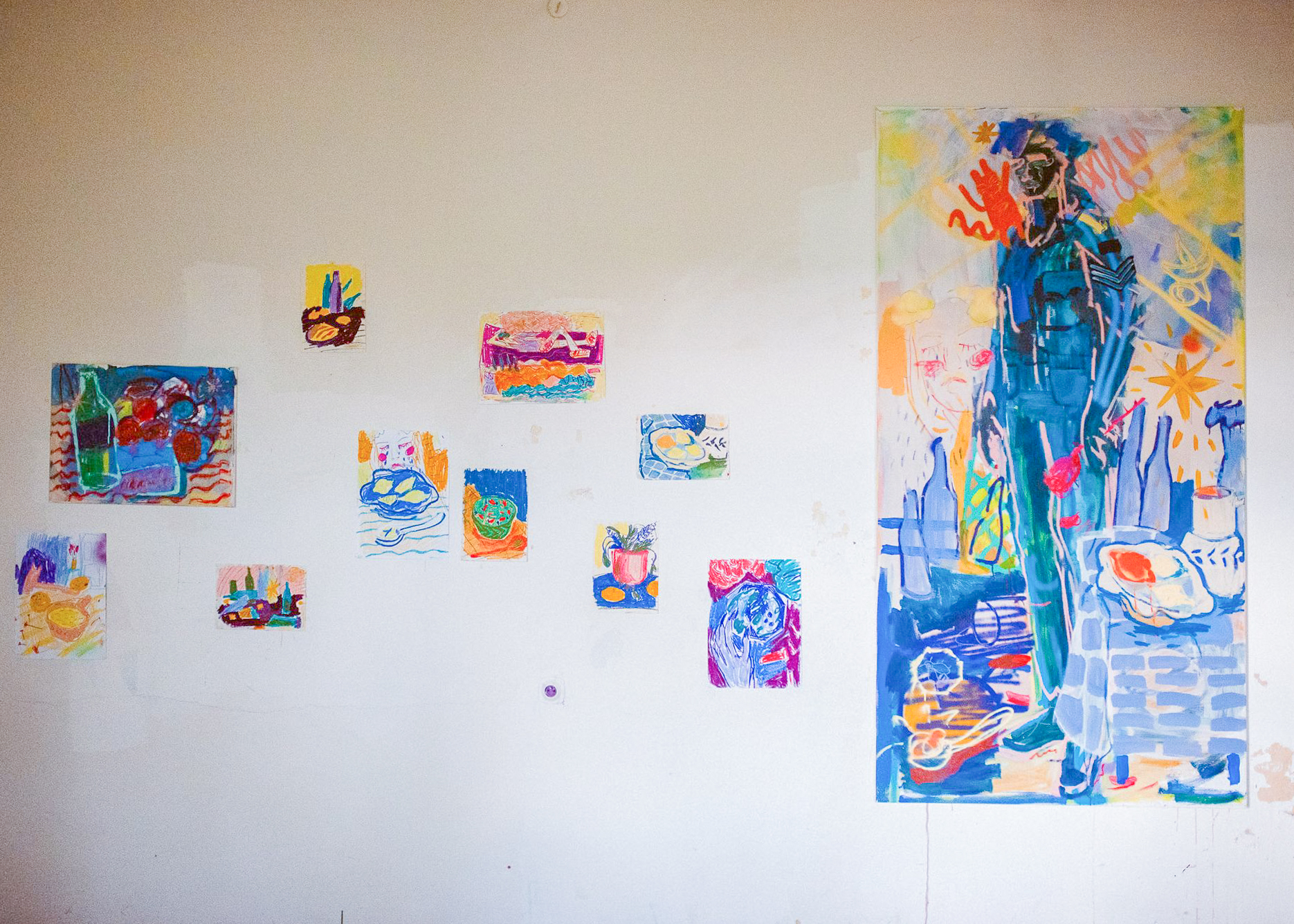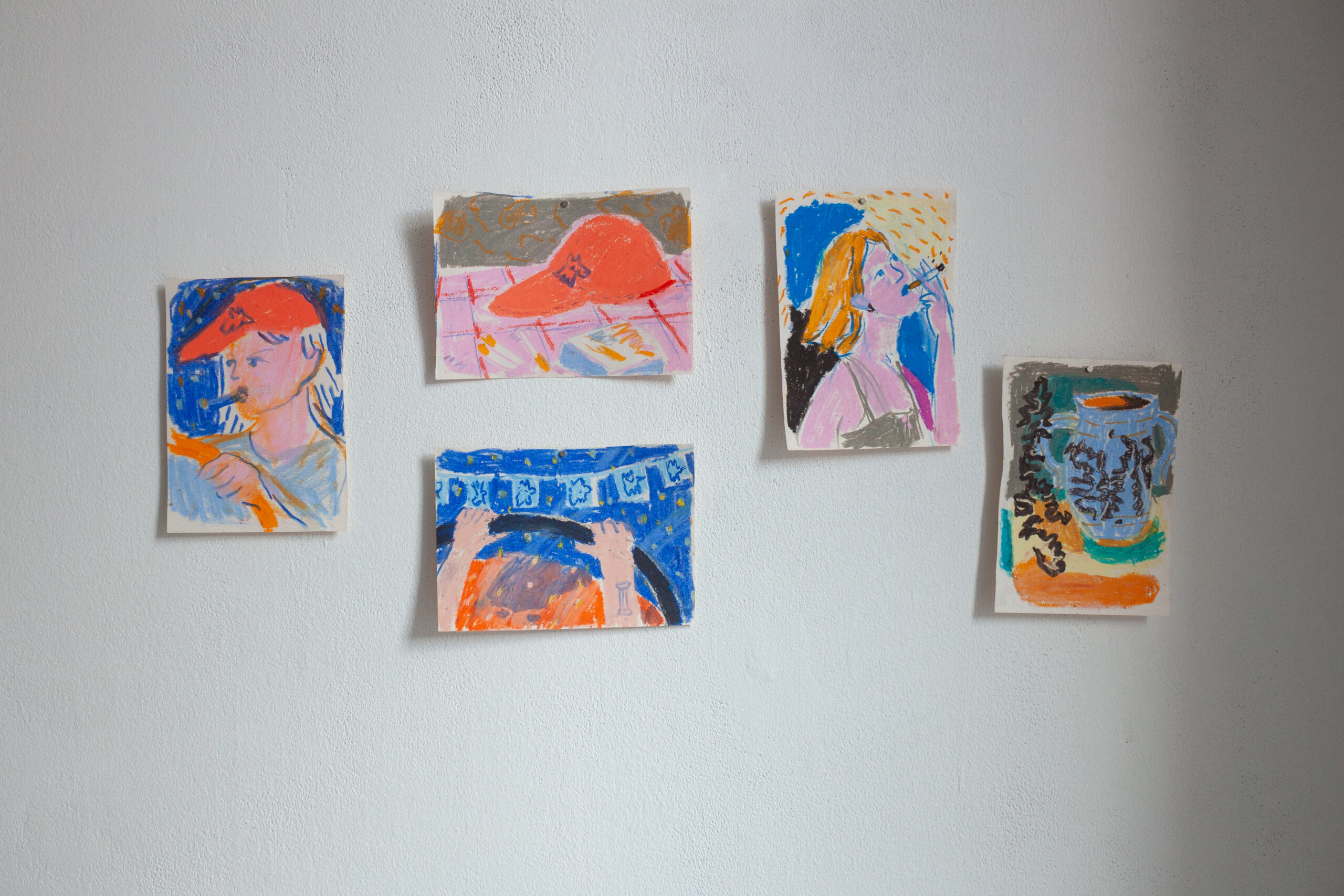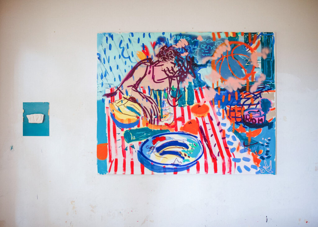 A: Často vycházím z příběhů starých bájí, mýtů, eposů, pověr nebo pohádek ale i z rapové subkultury a jejích veršů, které vysekávám a používám ilustrativně do obrazů. Ráda si hraju s humorem a ironií, zkratkovitostí, komiksem. Práce se slovem je pro mne všudypřítomná, asi se mi líbí symbióza textu a obrazu. To co neřeknou slova, to zastane obraz a naopak. Postavy se v obrazech objevují jakoby mimochodem, v pozicích snících či zamyšlených. Možná je to reakce na přemítání nad budoucností a ekonomickou krizí, která se s nadsázkou prolíná do vyobrazení různých zátiší (jídlo)… Velkou inspirací jsou mi umělci jako Bonnard, Matisse, Bazelitz, de Kooning, Basquiat…. P: Ve volné tvorbě pracuji se svým osobním příběhem, zamýšlím se nad vytržením člověka ze sebe, nad oddělováním těla, duše a mysli. Přemýšlím nad tempem společnosti a života ve městě, nad tím, jaký vliv má přemíra povinností, nároků na sebe sama a dlouhodobý stres na naše fyzické i duševní zdraví. Svou tvorbou se snažím poukázat na to, jak důležité je spojení s přírodou a se sebou. Vnímat se jako celek, komunikovat se svým tělem, věřit své duši a tím ovlivnit i svoji mysl. Nastavit si hranice, naučit se říkat ne a třídit obrovské množství možností, které máme. Jak je důležité mít čas v tichosti pro sebe, ale zároveň jak moc potřebujeme kolektiv a zázemí lidí, které máme rádi a bez kterých by to všechno vlastně vůbec nemělo smysl. A také jak je důležitá víra, a to v jakékoli podobě, která je pro nás přirozená. M: Vycházím z vlastních textů, myšlenek a pozorování. Zdánlivě nahodilých zápisků. Ty pak zpracovávám a rozvíjím v keramické tvorbě. Náměty modeluji ve hmotách, barvách, linkách, strukturách. Témata jsou pro mne nekonečnou aktualizací – v nepřehledném roji informační doby – je jich dost. D: Ve své tvorbě nejčastěji zpracovávám otázky, které jsou pro mě v daném období nejpalčivější, může jít o témata velmi osobní, jako je závislost, nebo velká současná společenská témata, která se mě dotýkají a významně je prožívám, jako např. klimatická krize.