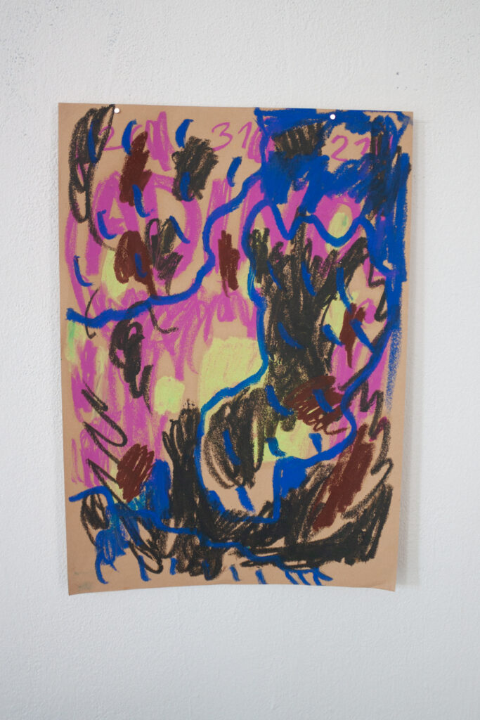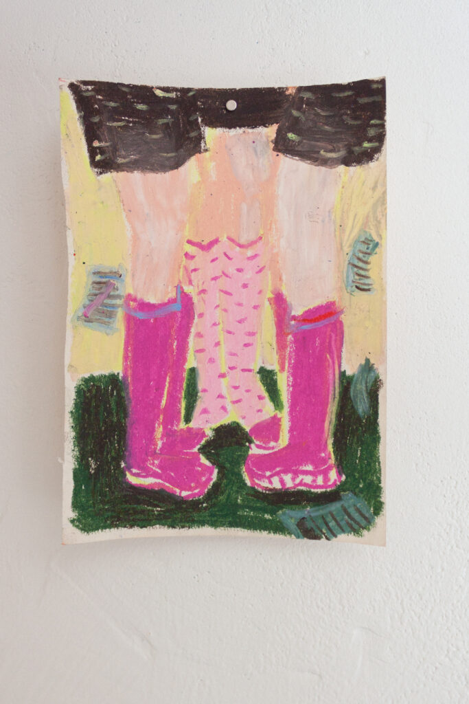 Jedním z takových obrazů je série kreseb Adiny, v nichž se členky kolektivu zjevují jako kamioňačky v kšiltovkách, jako posádka jedné kabiny, možná na polední pauze, možná na cestě bez cíle. Kamioňačka jako obraz svobody, samoty i sdíleného pohybu zhmotňuje sen o jiném tempu i jiném vztahu k práci. Je to role, která je zároveň silná i směšná, vážná i absurdní, a v níž se mohou promítat vlastní touhy po úniku nebo přerušení stereotypu.